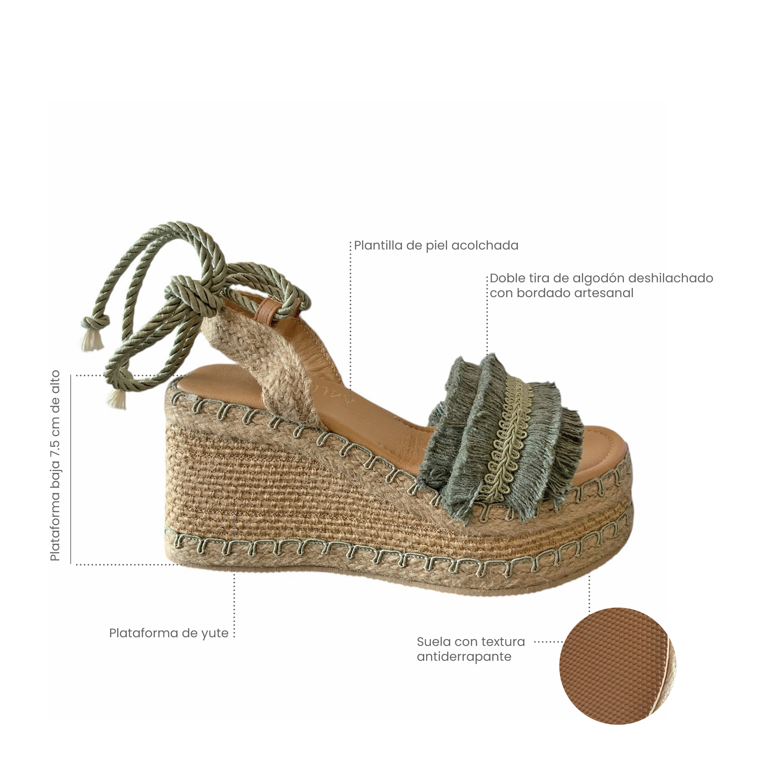 SUELA DE YUTE: Forrada con yute auténtico y bordado en color coordinado que realza su estilo artesanal.